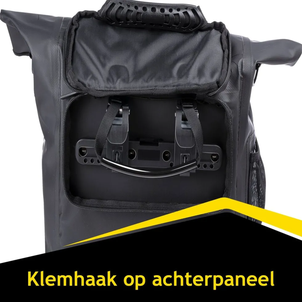 De fietsrugzak beschikt over twee stevige schouderbanden zodat je hem comfortabel als rugzak draagt. Door de meegeleverde tasriem met haken hang je het met hetzelfde gemak over je schouder en aan de bovenkant van de tas zit een handvat. Aan de achterkant van de fietsrugtas vind je twee kunststof klemhaken waarmee je de fietsrugtas aan je bagagedrager kunt vastmaken.