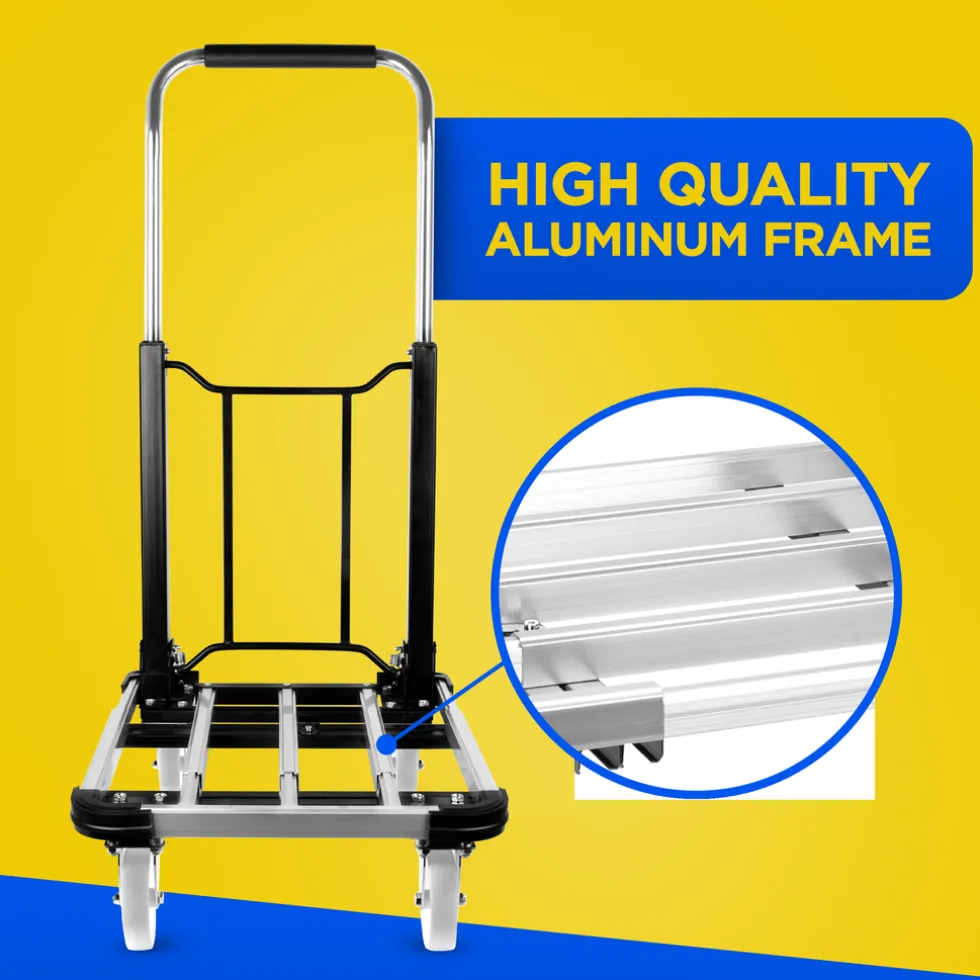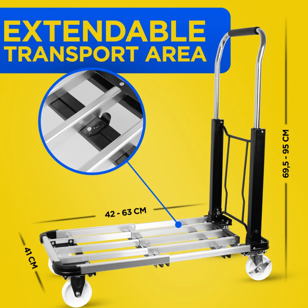 Inklappen maarDe kar heeft een duwbeugel met een softgrip handvat. De afmetingen van de trolley zijn 71 x 41 x 94,5 cmcentimeter. Gebruik je de transportwagen niet dan klap je hem in zodat je hem compact kunt opbergen. Je kunt de duwbeugel inklappen en het platform in elkaar schuiven zodat hij nog minder plaats inneemt.Het karretje meet opgevouwen56 x 41 x 23 cm.