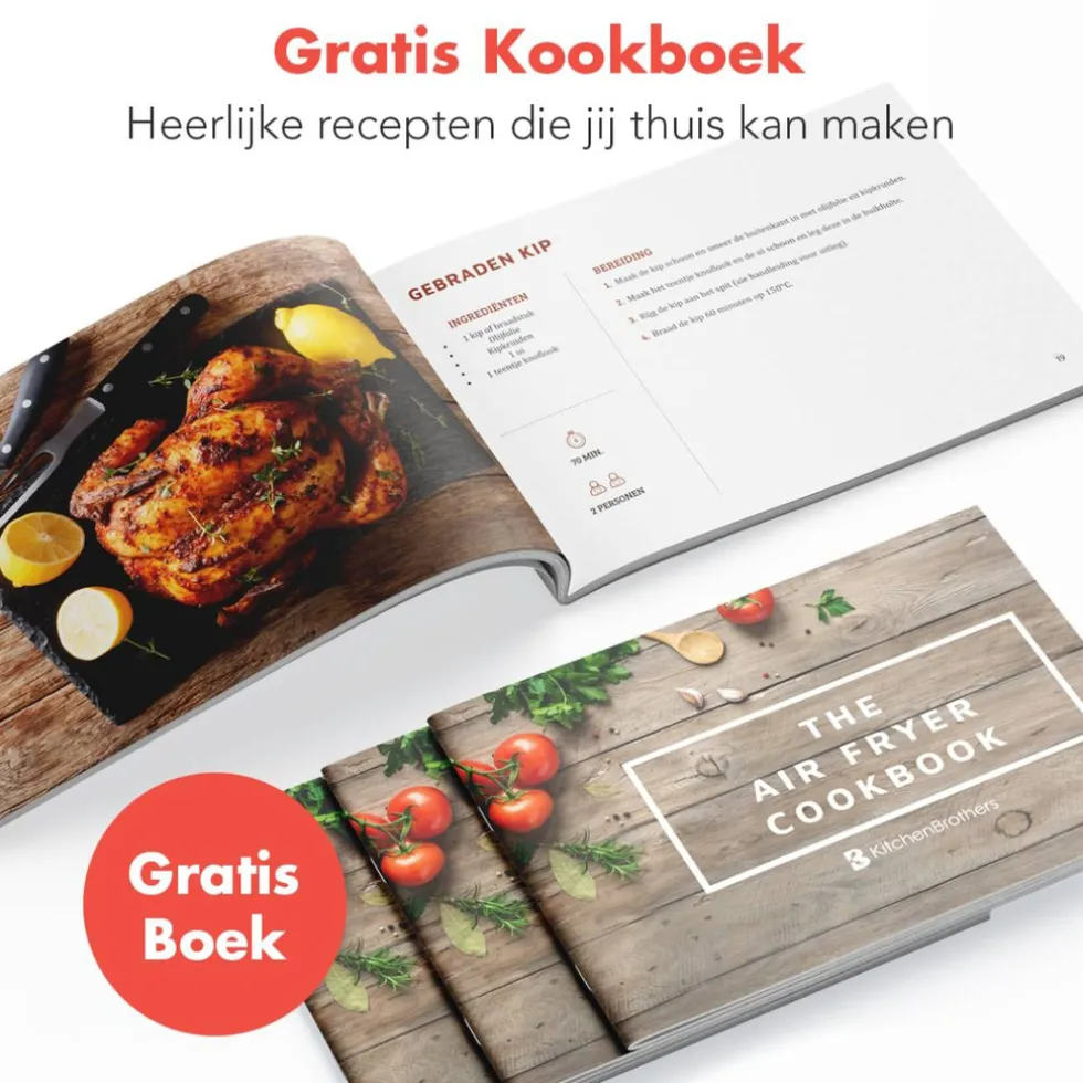Van luchtig bananenbrood tot hartige biefstuk, met de KitchenBrothers Airfryer zijn je opties eindeloos. Daarom hebben we een receptenboek gemaakt met 7 van onze favoriete gerechten. Er staan zowel recepten met vlees en vis als vegetarische gerechten in, dus voor ieder wat wils. Haal je schort uit de kast, zet de airfryer aan en en smullen maar!