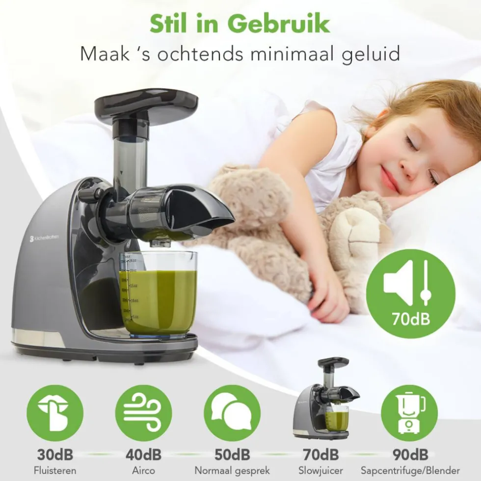 Anders dan een sapcentrifuge perst de slowjuicer op lage snelheid (80 RPM) de ingrediënten door een persschroef heen. Door op lage snelheid te persen, behoud je de voedingswaarde van je groente en fruit. De celstructuur van alle vitaminen, enzymen en mineralen blijven intact waardoor het sapje langer houdbaar is. Je krijgt op deze manier minder schuim, meer sap en een drogere pulp. Door op lage snelheid te persen zal het sap niet warm worden en ontstaat er minder oxidatie dan bij een sapcentrifuge. Bovendien zijn slowjuicers een stuk stiller dan sapcentrifuges (~70dB vs. ~90dB). Wel zo fijn ‘s ochtends!