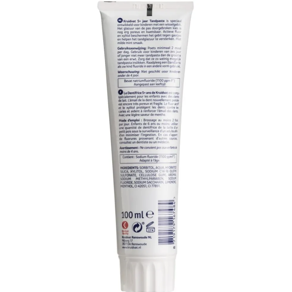 Kruidvat 5+ jaar Tandpasta is speciaal ontwikkeld voor kinderen met een wisselgebit. Het glazuur van de pas doorgebroken kies is nog erg poreus en kwetsbaar.