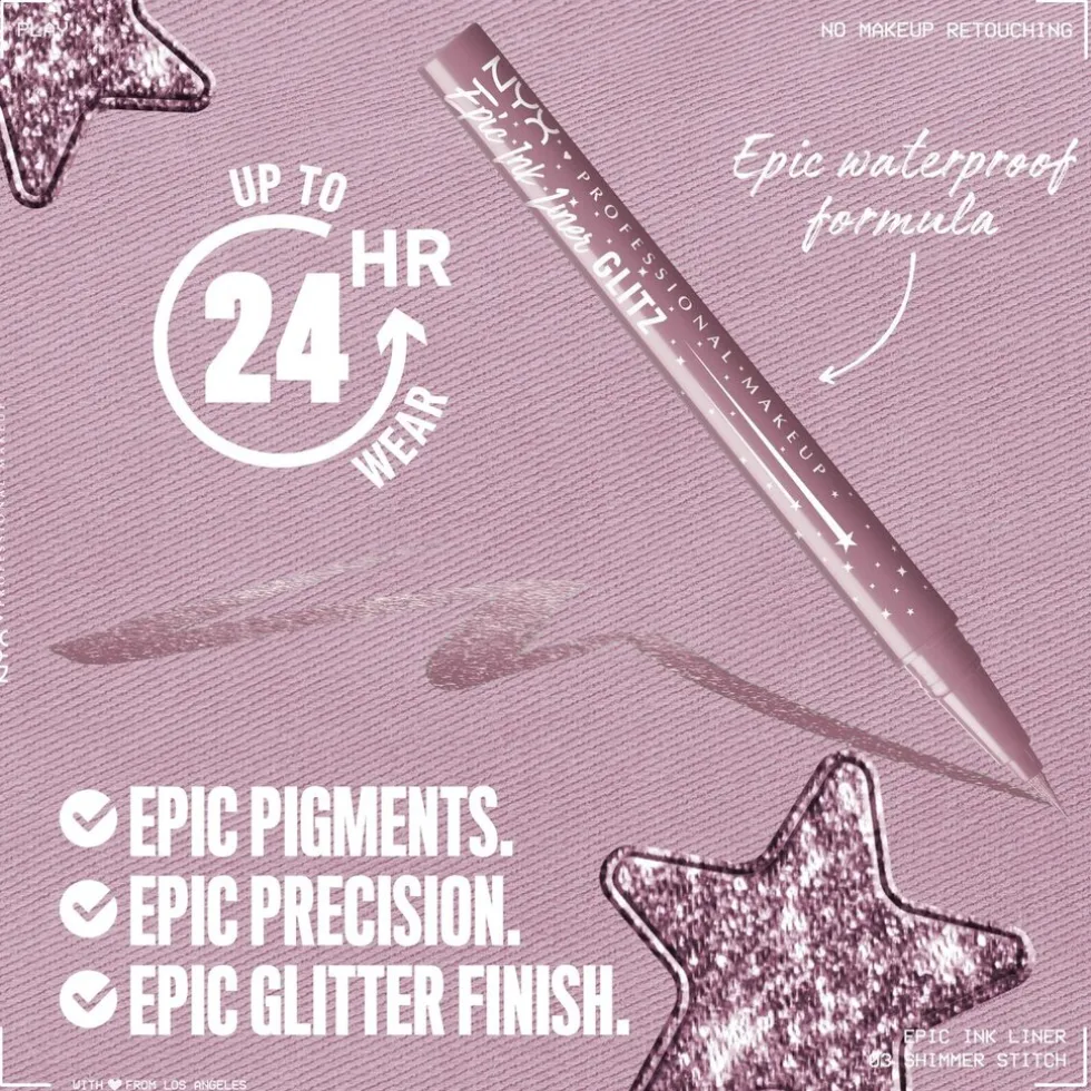Ontdek de intense, metallic kleuren en ultieme precisie van de NYX Professional Makeup Epic Ink Liner Glitz Shimmer Stitch 03 Eyeliner.