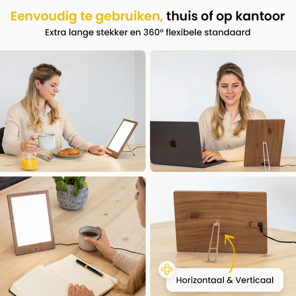 Deze daglichtlamp heeft een flexibele standaard, hierdoor kan je deze daglichtlamp niet alleen horizontaal en verticaal neerzetten, je hangt hem ook erg eenvoudig op aan deze standaard. Dit zorgt ervoor dat je de lamp in enorm veel situaties kunt gebruiken. Het enige wat je nog nodig hebt, is een stopcontact. Door de extra lange stekker van 180 cm kun je de lamp op geruime afstand positioneren van het stopcontact.