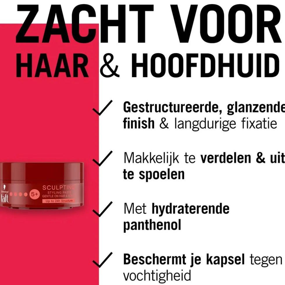 Je bent altijd in controle met de Taft Styling Sculpting Paste! Deze paste geeft je haar tot 24 uur lang hold en structuur met een glanzende finish.