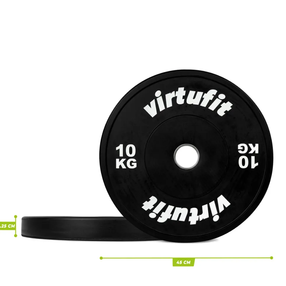 De Bumper Plates van VirtuFit zijn gemaakt van 100% rubber, gebonden met pur en hebben een gietijzeren binnenring. Dankzij het stevige rubber gaan de bumper plates jarenlang mee. Alle bumper plates hebben een even grote diameter, maar per gewicht verschillen ze in breedte.