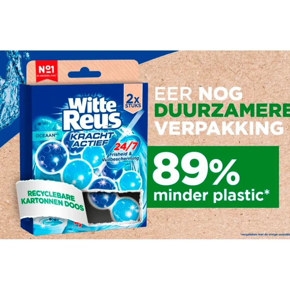 Het Witte Reus toiletblok combineert effectieve reiniging met langdurige frisheid. De 4-in-1 formule zorgt voor een schoon toilet, voorkomt kalkaanslag en houdt je wc fris ruiken. Bovendien is dit wc-blokje een stapje duurzamere keuze: de verpakking is recyclebaar en bevat minder plastic.