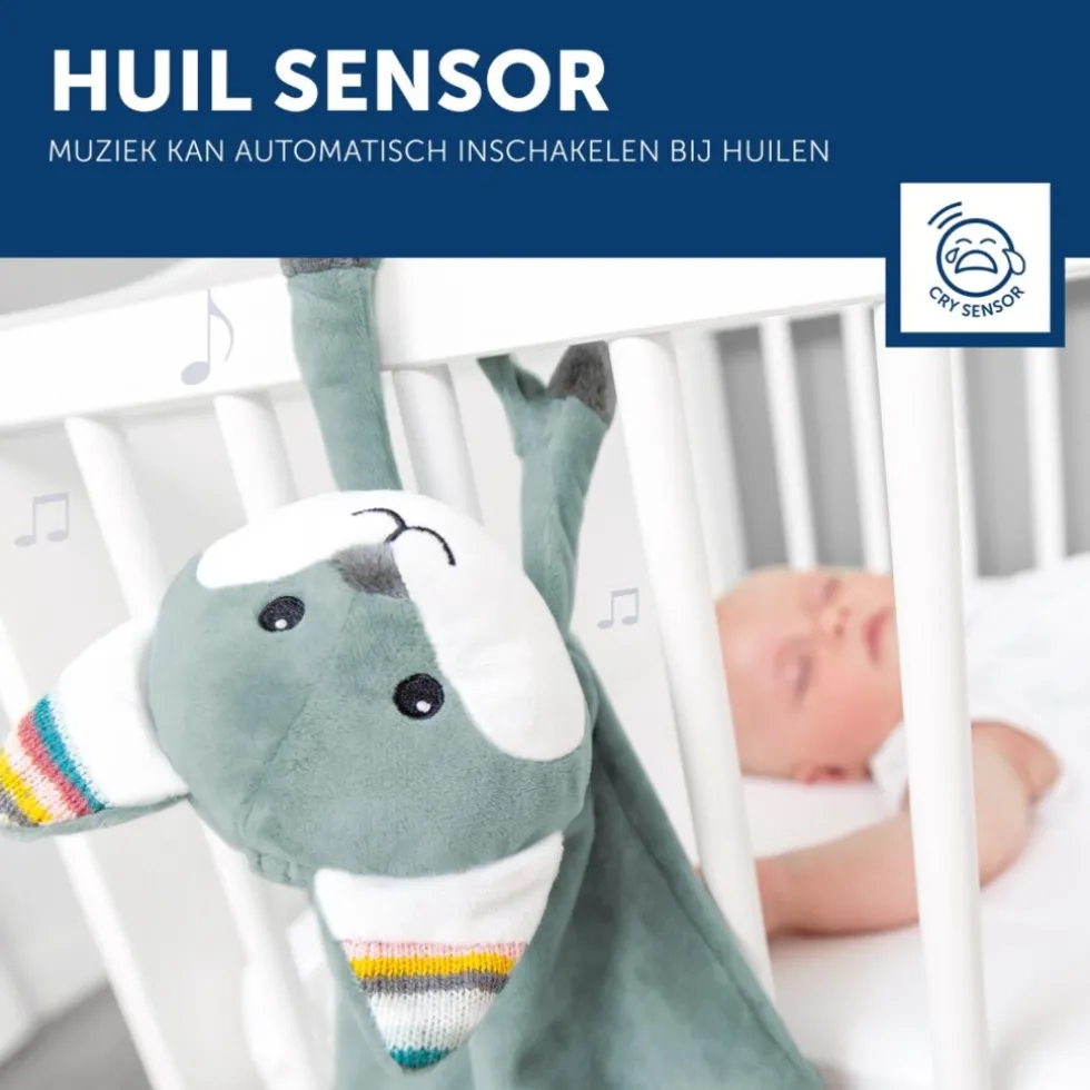 • 6 verschillende geluiden: hartslag, natuurgeluiden, white noise en 3 slaapliedjes
